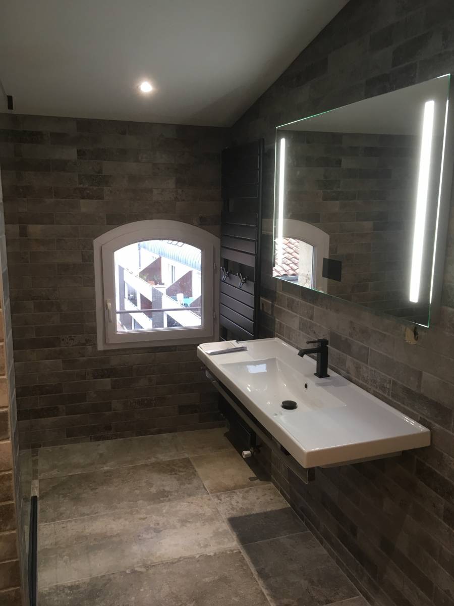 Suite a la demande de notre client nous avons procédé a une rénovation de salle de bain. Tout d'abord nous avons commencé par la démolition de l'ancien sanitaire existant, ainsi que les revetements sols et murs. Ensuite nous avons définies l'emplacement du futur sanitaire et modifier les arrivées eau chaude et eau froide et les écoulements. Puis nous avons posé le chassis support du wc suspendu puis a suivre le bac a douche extrat plat. Aprés il y a eu la modification du réseau chauffage pour le séche serviette et les plaquistes carreleur font leur job pendant quelques jours avant la pose finale du sanitaire.